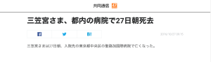 三笠宮さま逝去、百合子さま立ち会う